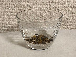『ぐい呑み』虎模様は、グラスの底に金地に黒色で虎模様が描かれたぐい呑みタイプのグラス。金と黒で描かれた虎の模様、チャーミングな絵柄のグラスです。