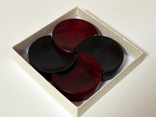 黒っぽい深緑色の拭き漆と紅色の拭き漆がの箸置きが2個ずつ計4個でセットにしています。