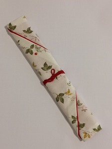 白地にシンプルな花柄の布、内側には赤い布が使われています。